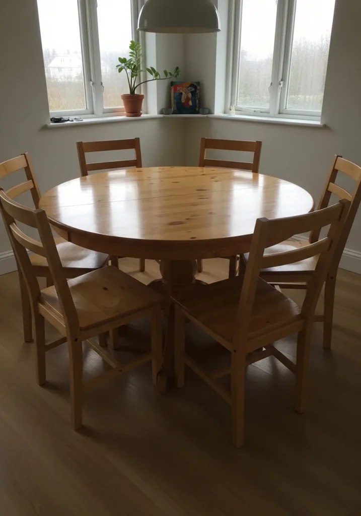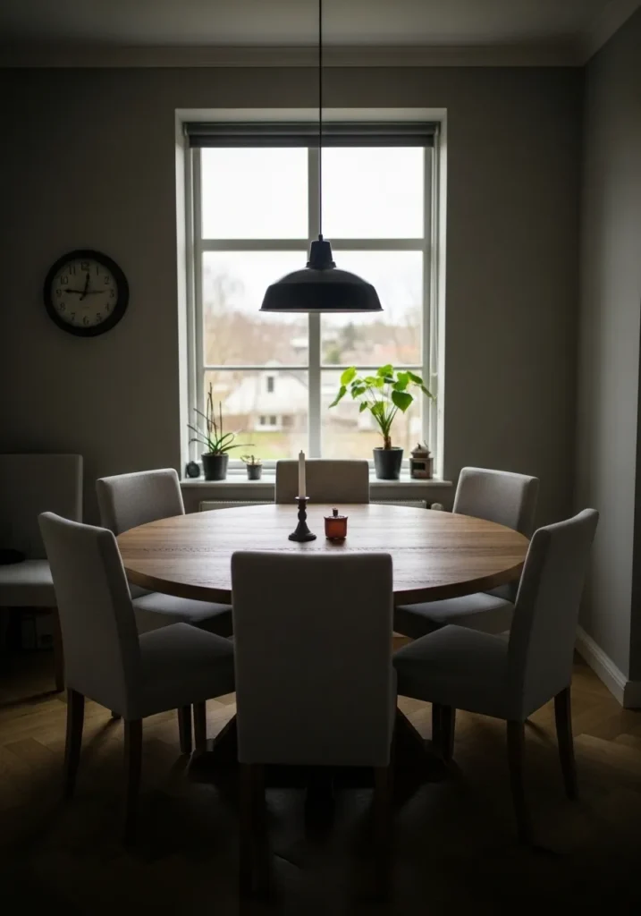 This round wooden dining table creates a gentle and welcoming flow in the room. With six matching chairs evenly spaced, it feels naturally balanced and easy to move around. The windows bring in soft daylight, making the space feel cheerful and open. The round shape also helps soften the room and makes it feel more relaxed.