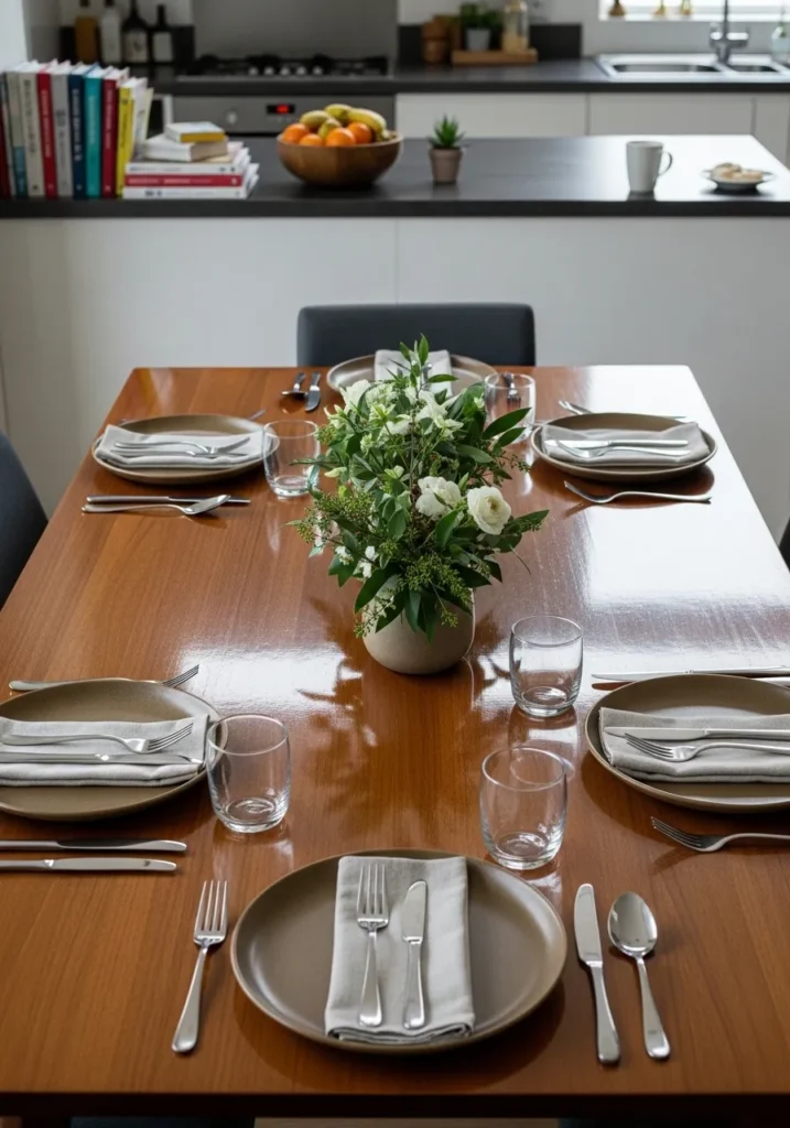 This dining table has a smooth wood surface paired with six neatly arranged place settings. The chairs are simple and modern, keeping the focus on the table itself. A small floral arrangement adds softness to the otherwise clean look. The open kitchen nearby makes the space feel connected and functional.