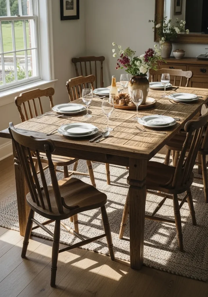 This dining setup combines a solid wooden table with cushioned chairs in soft neutral tones. The light coming through the windows adds warmth and highlights the natural grain of the wood. The room feels enclosed enough to be cozy, yet bright enough to stay airy. Everything feels thoughtfully placed, which helps the table shine without overwhelming the space.