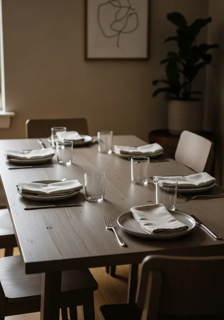This dining table features a darker wood finish paired with simple chairs that keep the look clean and modern. The low light creates a cozy atmosphere, while the table setting feels intentional but not formal. Everything is neatly aligned, giving the space a calm and balanced feel. The darker tones help ground the room and make it feel intimate.