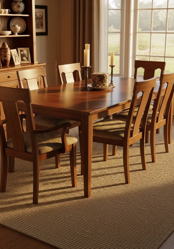 This dining area centers around a solid wooden table with six matching chairs that feel timeless and sturdy. Soft daylight comes through the window, warming up the wood tones and the textured rug underneath. The furniture feels well proportioned, leaving enough room to sit comfortably without crowding. Everything feels familiar and inviting.