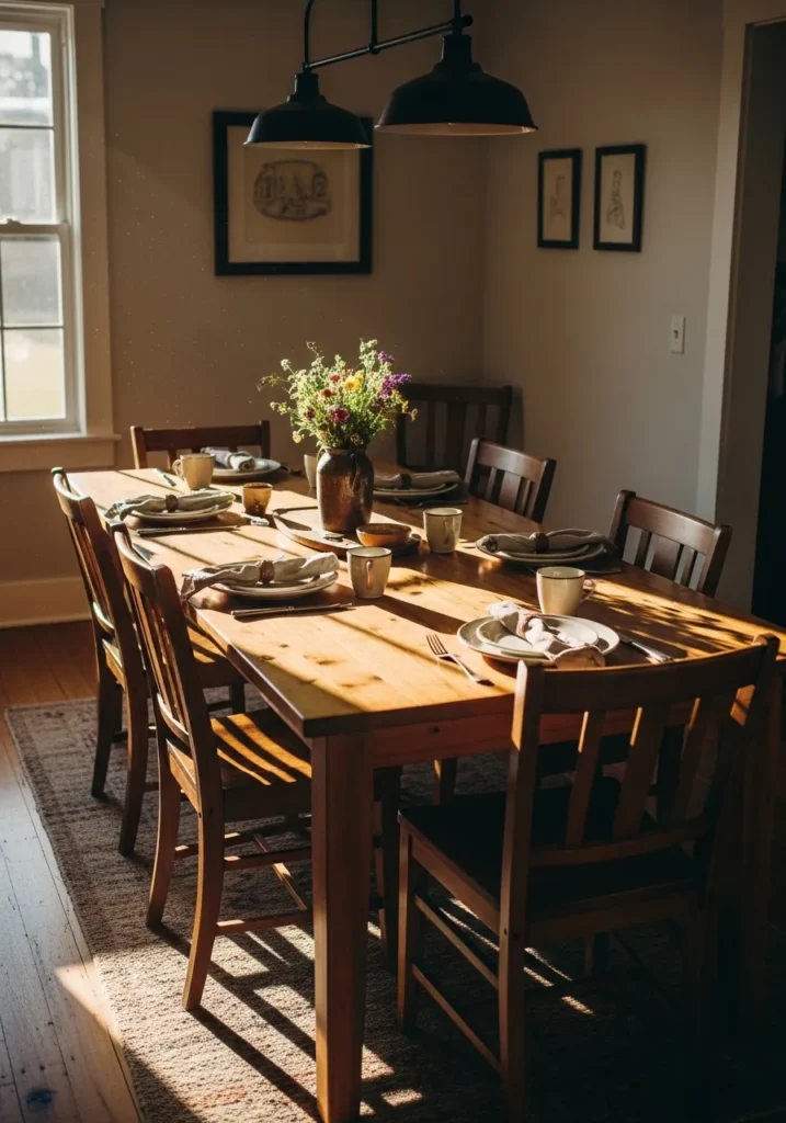 This dining table sits in a softly lit room with warm wood tones and classic chairs that add character. The table setting feels casual and lived in, while the overhead lights create a gentle focal point. Everything feels close and connected, which adds to the cozy atmosphere. It is a space designed for togetherness.