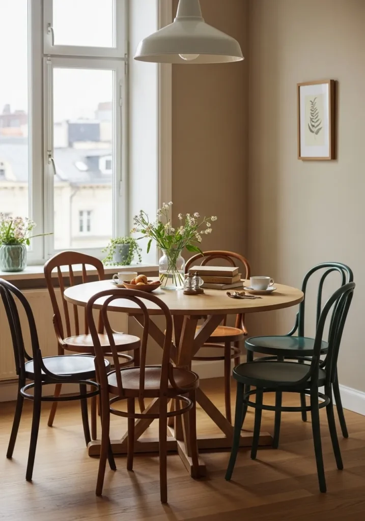 This dining area mixes a wooden table with different chair styles, creating a playful yet balanced look. The soft light from the windows keeps everything feeling open and cheerful. The round table shape encourages easy movement and conversation. Plants add a touch of freshness that brings the room to life.