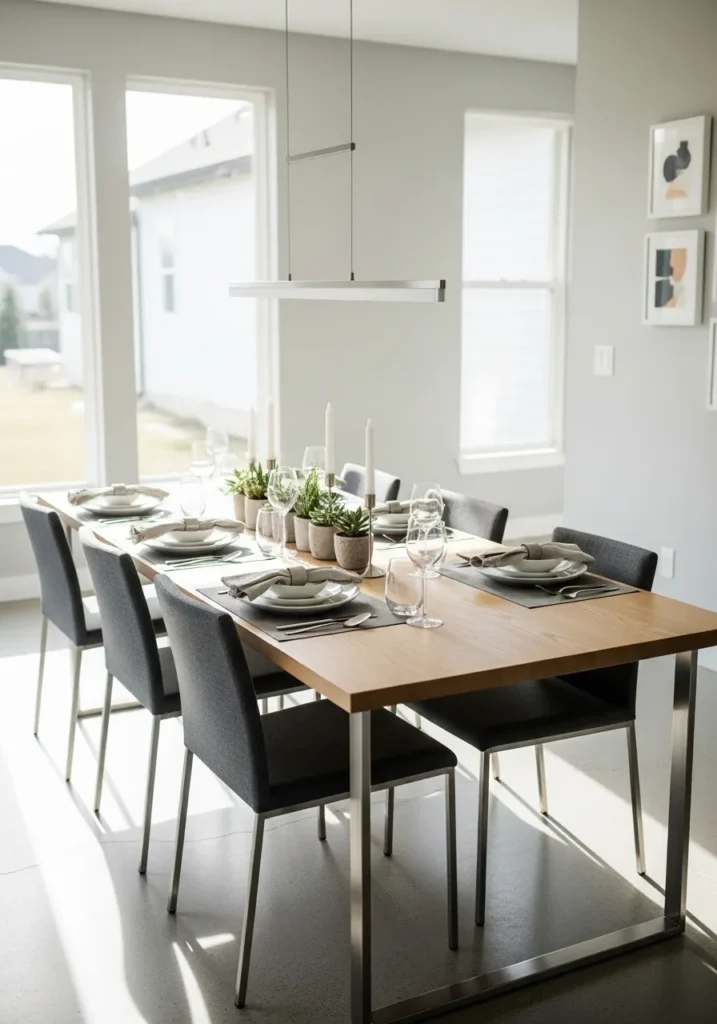 This dining space pairs a warm wooden table with darker chairs that create a clean and modern contrast. Large windows flood the room with daylight, keeping everything feeling fresh and open. The table is set neatly without feeling stiff, which makes it ideal for everyday meals and casual hosting. The layout feels balanced and practical, with enough space for six people to sit comfortably.