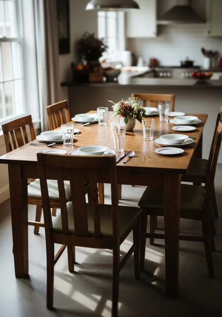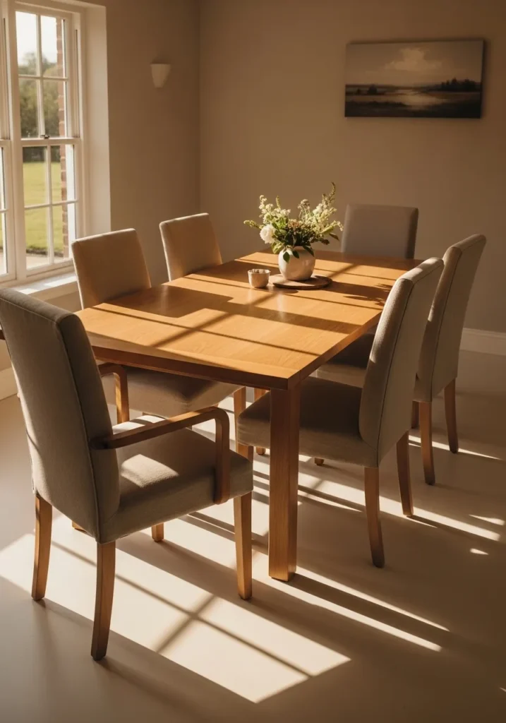 This dining table leans into a classic wooden look with matching chairs that feel sturdy and reliable. The sunlight hitting the table creates beautiful shadows across the floor, giving the whole room a warm and lived in feeling. Everything is arranged in a very straightforward way, which makes the space practical for daily meals and casual gatherings. The light flooring helps keep the room from feeling heavy.
