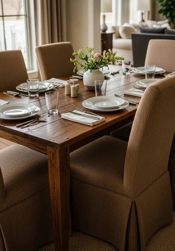 This dining table is framed by six upholstered chairs that instantly make the space feel more comfortable. The rich wood tone of the table adds depth, while the soft fabric chairs balance it out with a cozy feel. The table setting looks thoughtful but not stiff, which makes the space feel ready for real use. Everything feels grounded and welcoming.
