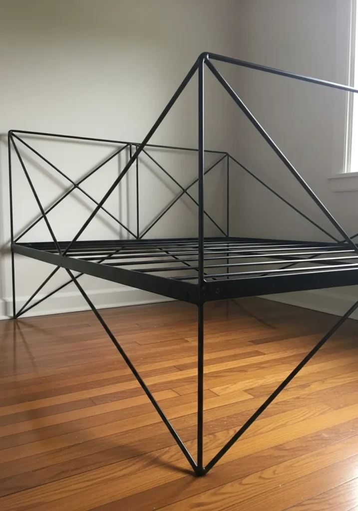 This metal bed frame feels more like a piece of modern art than a typical bed. Sharp angles and geometric lines create a bold open structure that instantly draws the eye. The slim black metal frame sits lightly on warm wood floors and lets light move freely through the space. Everything feels airy and intentional with the frame doing all the visual work without needing extra decor.