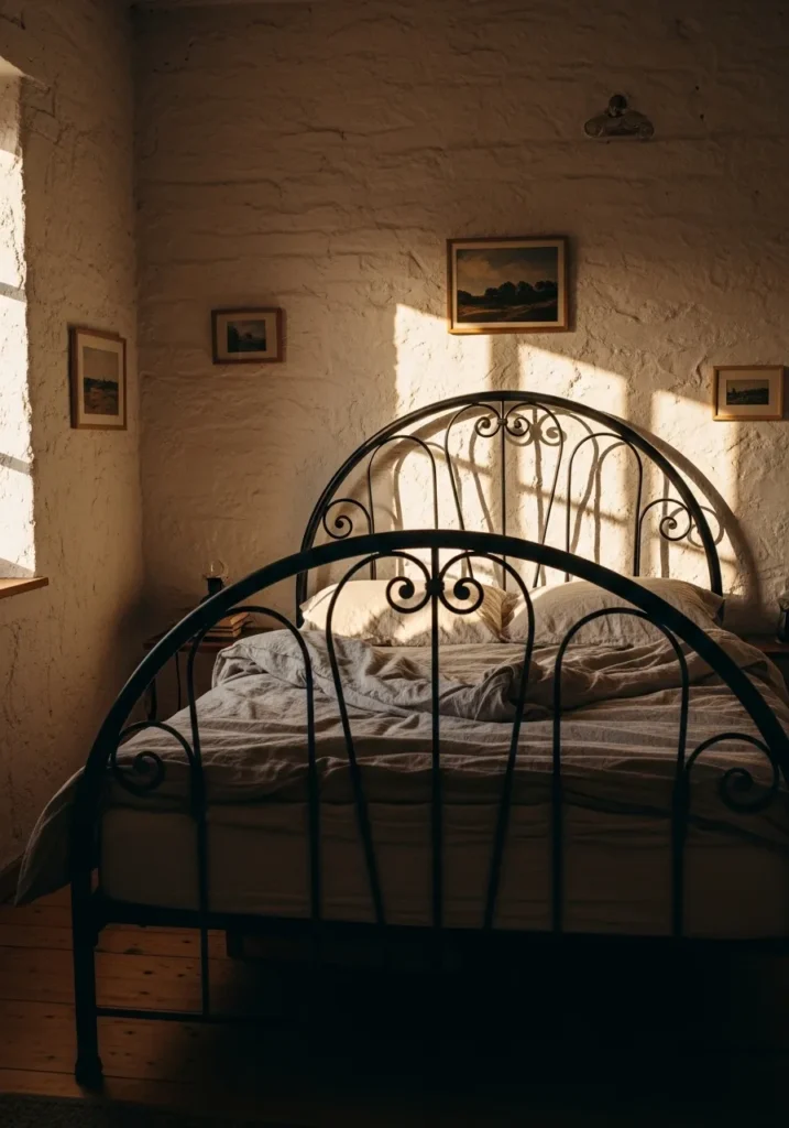 This bedroom features a beautifully curved iron bed frame with classic scroll details that feel timeless and full of character. The dark metal stands out against textured plaster walls and warm wood floors, creating a cozy and grounded atmosphere. Soft bedding and natural light add warmth while small framed artworks and simple furnishings keep the space feeling personal and lived in. Everything about the room feels calm, collected, and quietly charming.