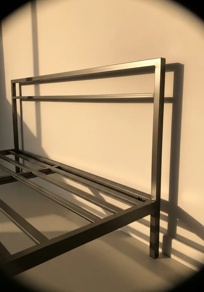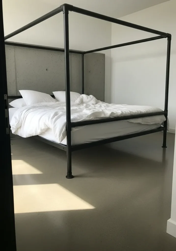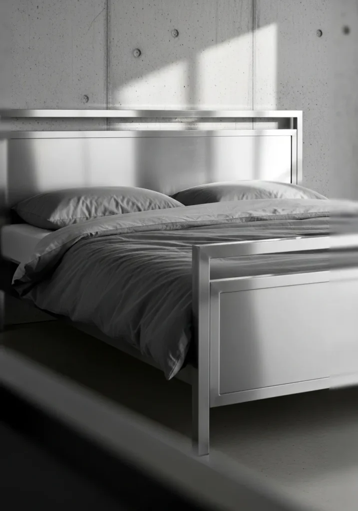 This bedroom features a sleek metal bed frame with smooth panels and a cool brushed finish that feels clean and architectural. The soft gray bedding blends seamlessly with the concrete wall and creates a calm tonal palette. Sharp lines and solid construction give the bed a strong presence while still keeping the room open and uncluttered. Natural light casts gentle shadows across the metal surface and adds depth without any extra styling.