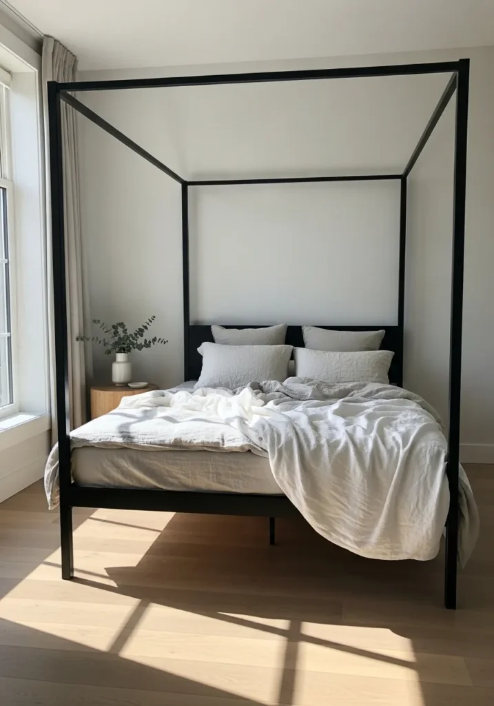 This bedroom features a striking black metal canopy bed with clean lines and an open frame that feels both bold and breathable. The strong structure creates a beautiful contrast against the soft white walls and light wood floors. Crisp bedding and relaxed linens keep the look easy and inviting while natural sunlight casts gentle shadows that highlight the frame. Everything feels balanced and uncluttered with just enough detail to let the bed shine.