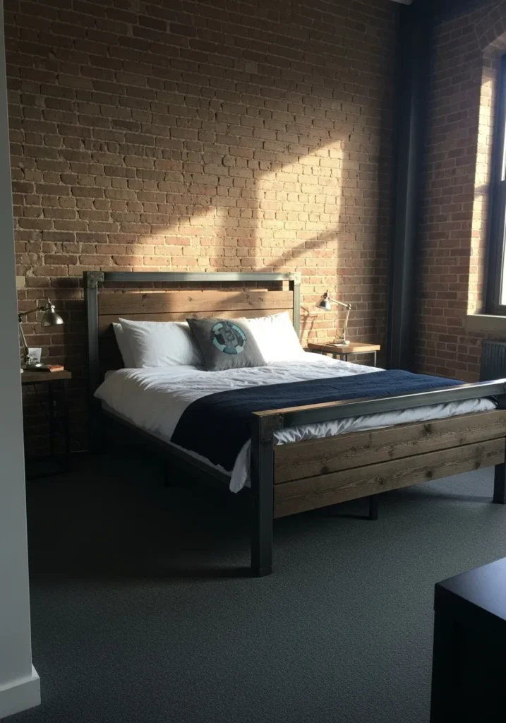 This bedroom pairs a bold metal bed frame with warm wood panels that feel grounded and inviting. The sturdy black metal edges frame the bed with clean structure while the wood adds texture and balance against the exposed brick wall. Soft bedding and simple bedside lamps keep the space relaxed and practical. Natural light hits the brick and metal just right and gives the room that effortless loft apartment feel.