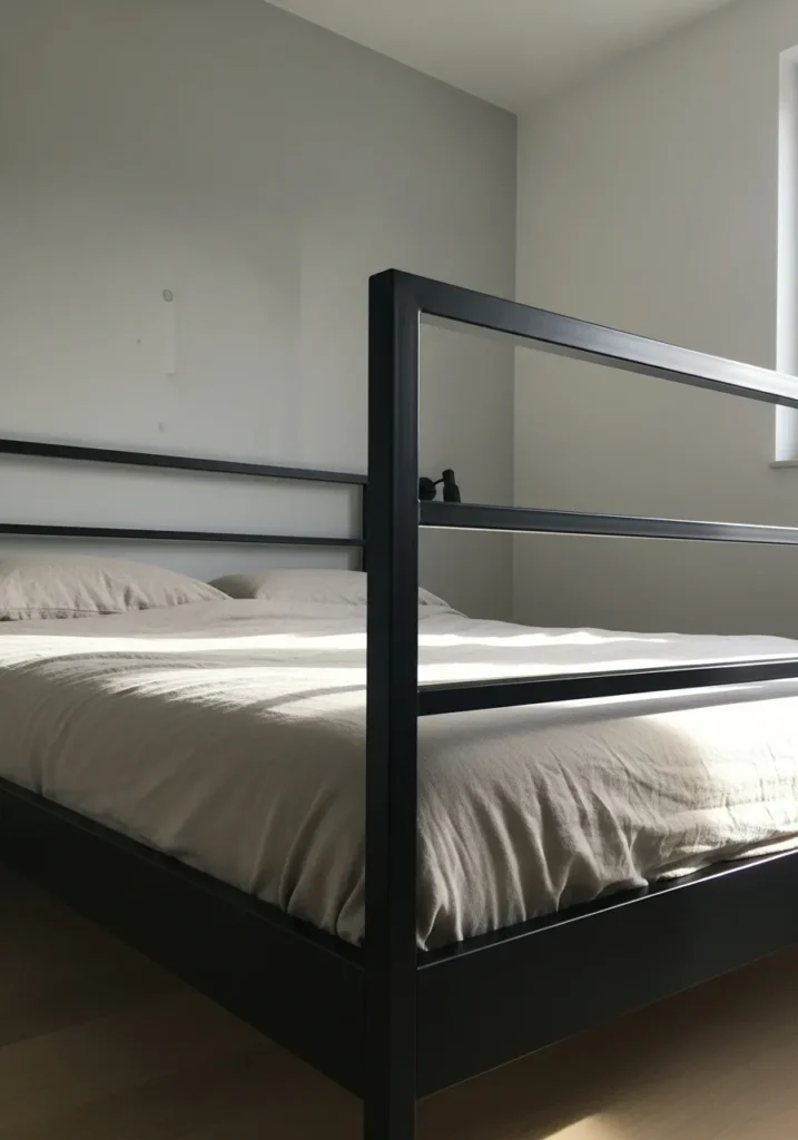 This bedroom features a strong black metal canopy bed with thick rails and a solid grounded frame. The simple rectangular shape feels architectural and confident while the neutral walls and soft bedding keep the space calm and uncluttered. Light from the window highlights the clean edges of the metal and adds warmth to the room. The overall look feels modern and intentional without relying on extra decor.