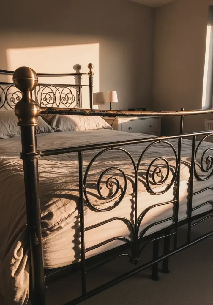 This bedroom features a classic iron bed frame with elegant scrollwork and softly aged metal details. The curved lines and rounded posts give the bed a romantic vintage feel while the warm light brings out the character in the metal. Neutral bedding keeps the look relaxed and lets the frame shine without feeling heavy. The simple room layout and gentle sunlight create a calm and inviting atmosphere.