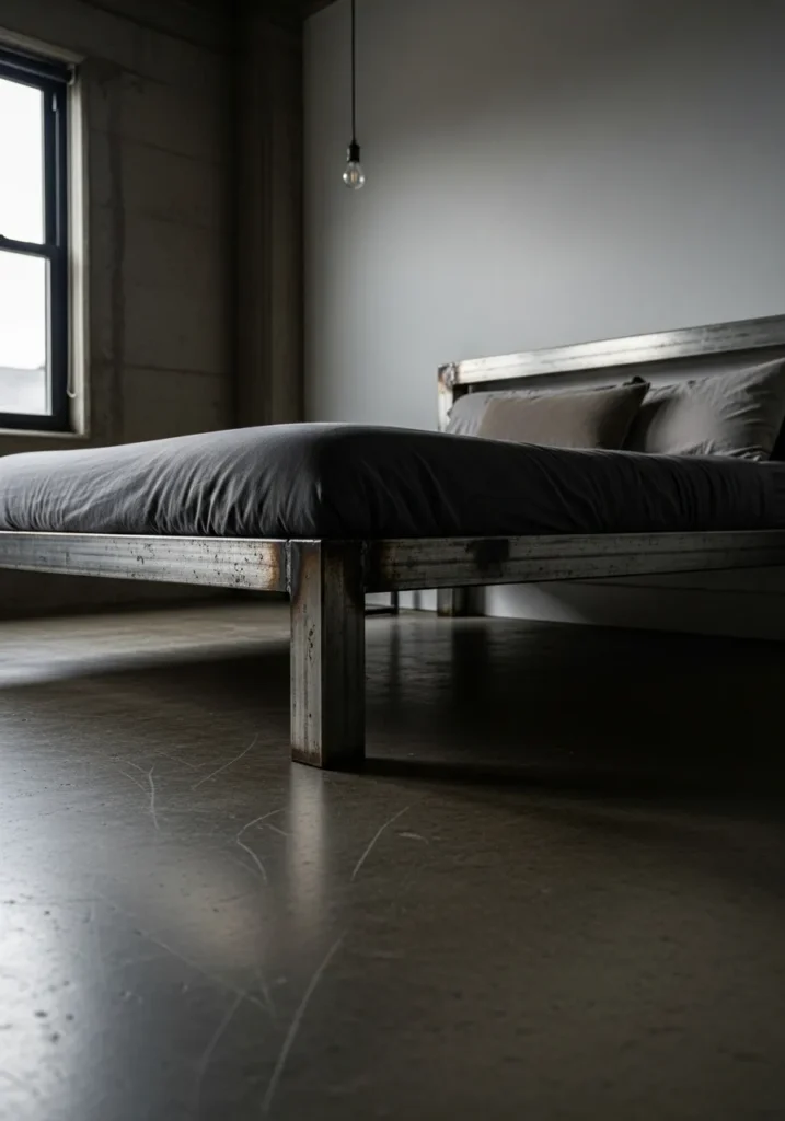 This bedroom features a low metal bed frame with a raw industrial finish that feels solid and grounded. The brushed metal surface shows subtle texture and wear which adds depth without feeling rough. Dark bedding and a concrete floor give the space a calm moody vibe while soft natural light from the window keeps it from feeling too heavy. The minimal setup lets the bed frame stand out as the main design feature.