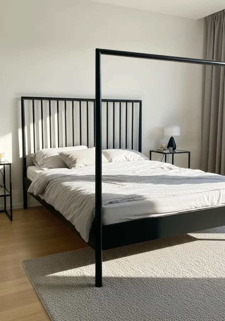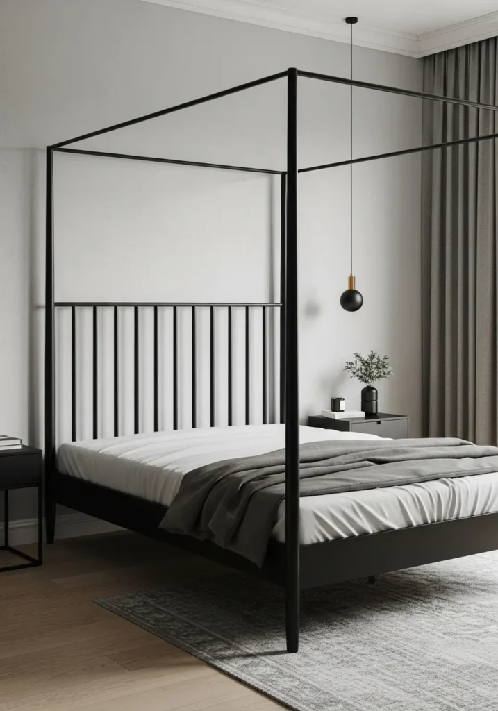 This bedroom features a refined black metal canopy bed with slim lines and a perfectly balanced frame. The vertical slat headboard adds structure while still feeling light and open. Soft gray bedding and a muted rug keep the space calm and cohesive. Minimal furniture and simple lighting allow the bed to stand out without the room feeling busy or crowded.