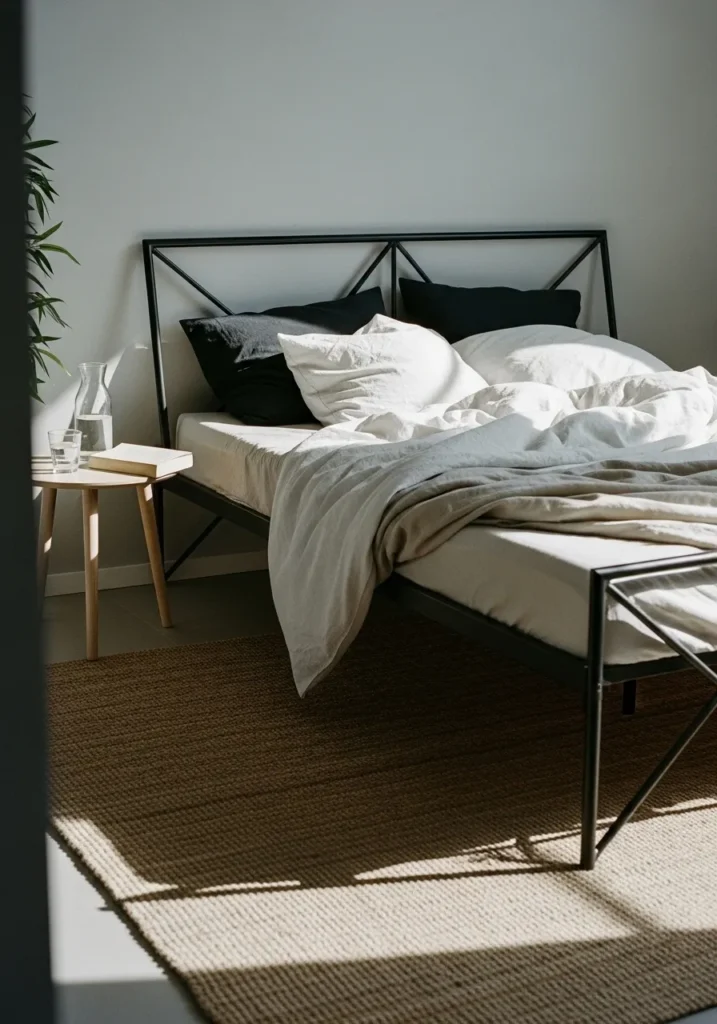 This bedroom features a sleek metal bed frame with a geometric headboard that adds subtle visual interest without overpowering the space. The slim black frame keeps the look light and airy while the crisscross detail brings just enough structure. Soft white bedding mixed with darker pillows creates contrast and warmth. A simple side table and woven rug ground the room and keep everything feeling casual and lived in.