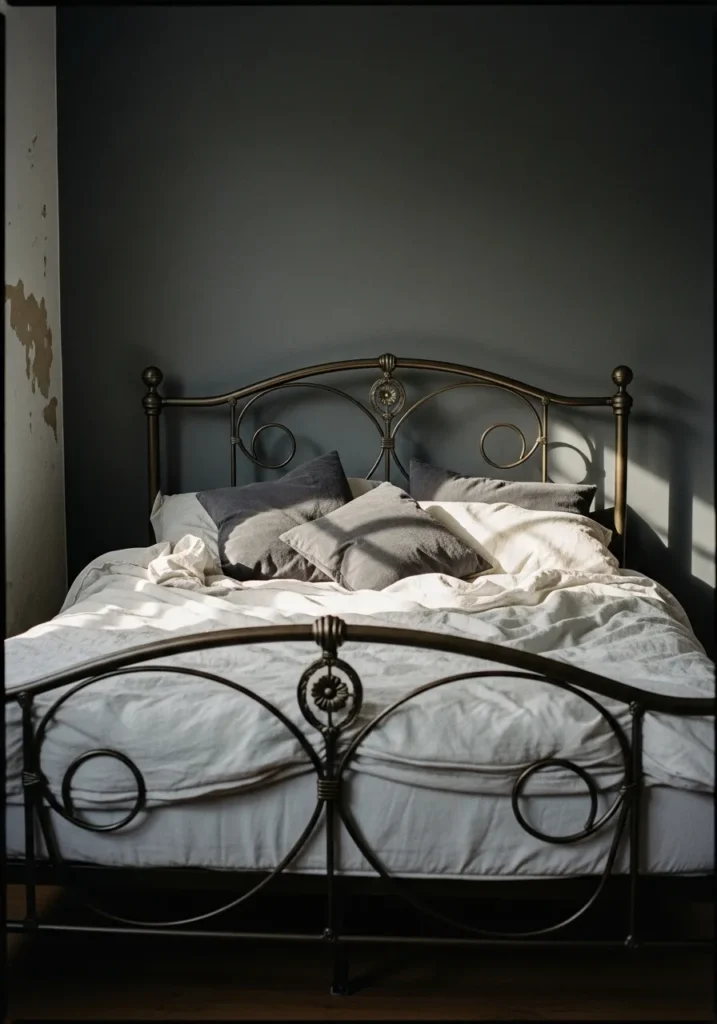 This bedroom highlights a classic metal bed frame with soft curves and decorative scrollwork that instantly brings in old world charm. The dark iron finish feels rich and slightly aged, which pairs beautifully with the muted wall color and relaxed white bedding. Light filters across the bed in a gentle way, creating contrast between shadow and metal detail. The look feels intimate and layered, with just enough texture to keep it from feeling too polished.