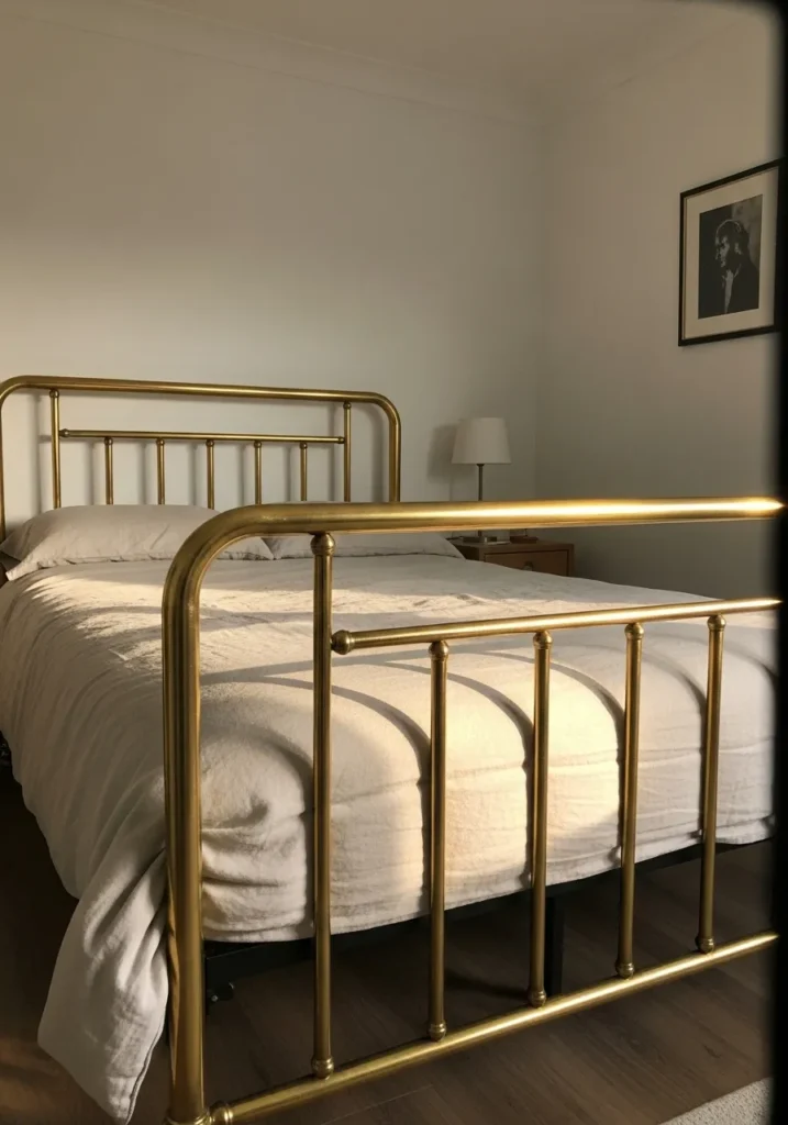 This bedroom features a beautiful brass metal bed frame with rounded edges and vertical bars that feel classic yet fresh. The warm metallic tone stands out softly against crisp white walls and simple bedding. Clean lines keep the look uncluttered while the gentle sheen of the brass adds just enough glow to make the bed feel special. Everything feels balanced and calm with a quiet elegance that does not rely on excess decor.