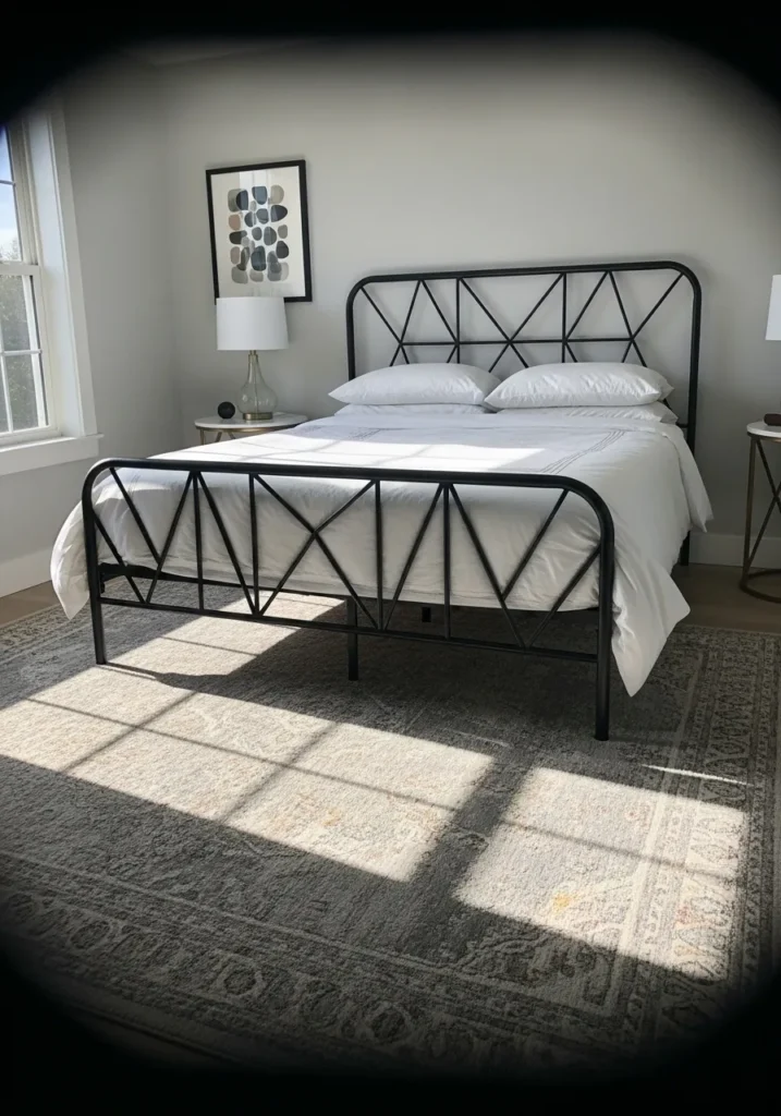 This bedroom showcases a bold black metal bed frame with a geometric crisscross design that instantly adds visual interest. The structured pattern feels strong and intentional while the slim frame keeps the room light and open. Crisp white bedding softens the look and lets the metalwork stand out without feeling busy. Natural light pours in through the window and casts gentle shadows that highlight the lines of the frame and the subtle texture of the rug.