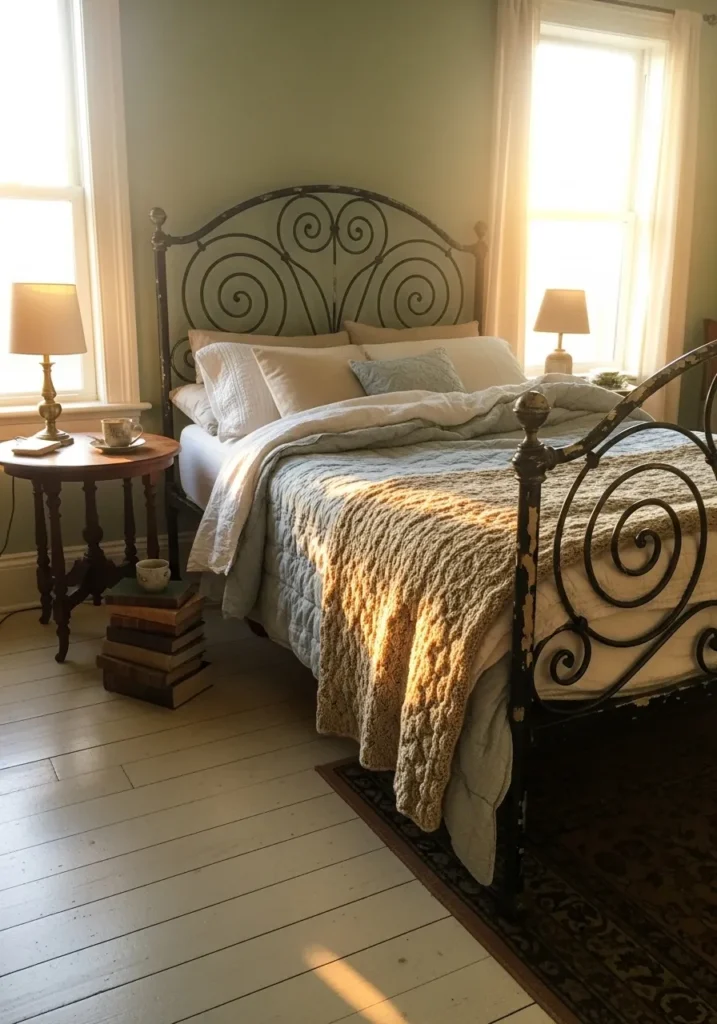 This bedroom features a beautifully aged metal bed frame with graceful scrollwork and a gently worn finish. The curved details give the frame a romantic feel that pairs perfectly with the muted green walls and soft layered bedding. Natural light pours in through the windows and creates a warm glow across the textures in the room. Wood floors and simple side tables keep the space grounded and relaxed while letting the bed remain the quiet star.