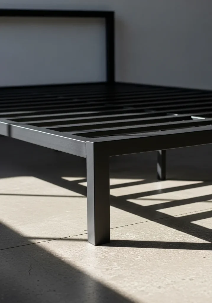 This bedroom features a clean metal bed frame with a slim profile and simple horizontal lines that feel light and modern. The dark metal contrasts gently with the warm wall tone while the open structure keeps the space feeling uncluttered. Sunlight hits the frame at an angle and creates soft shadows that highlight the shape and craftsmanship. Everything feels calm and intentional with no extra details competing for attention.