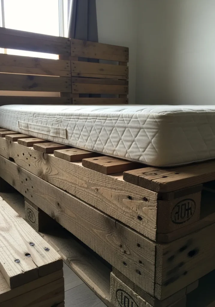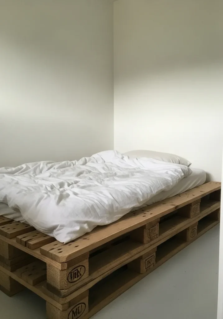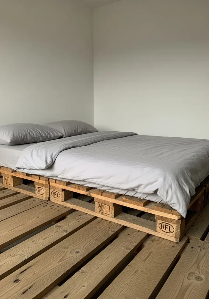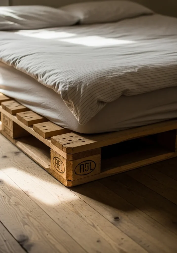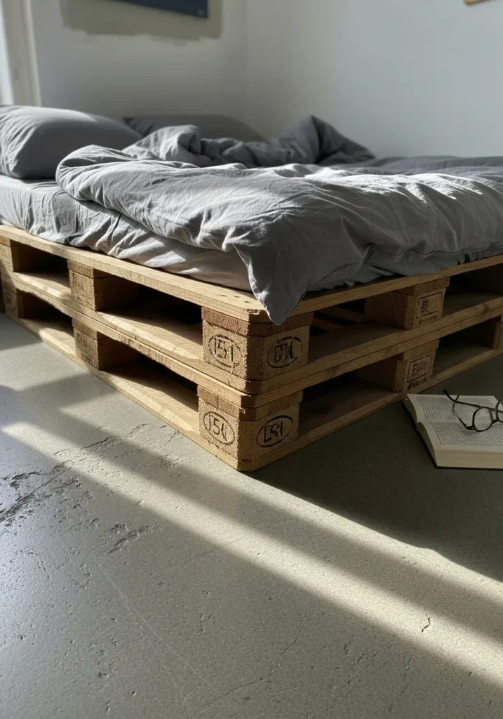 This pallet bed frame sits close to the floor and highlights the beauty of raw wood. The stacked pallets create a sturdy base with visible grain and stamped markings that add character. Soft neutral bedding and a simple mattress keep the look clean, while sunlight across the wooden floor makes the whole setup feel calm and grounded.