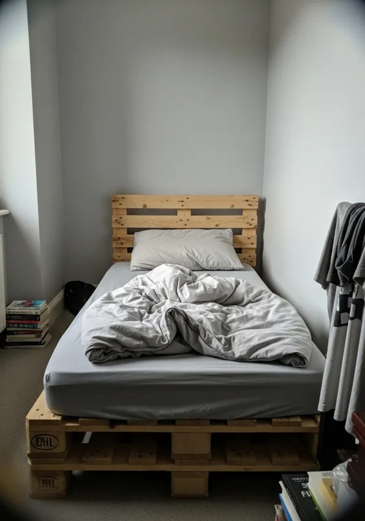 This pallet bed frame fits neatly into a compact bedroom, using a simple stacked pallet base and a short pallet headboard. The natural wood adds warmth without overwhelming the space. Soft gray bedding keeps the look relaxed, while the tight layout makes the room feel practical and thoughtfully arranged.