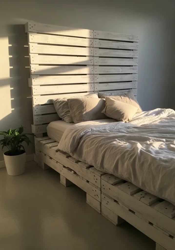 This pallet bed frame features a soft whitewashed finish that brightens the entire room. The stacked pallets create a sturdy base, while the tall slatted headboard adds height and structure without feeling heavy. Neutral bedding and warm sunlight keep the space light and relaxed, with just enough texture to avoid looking flat.