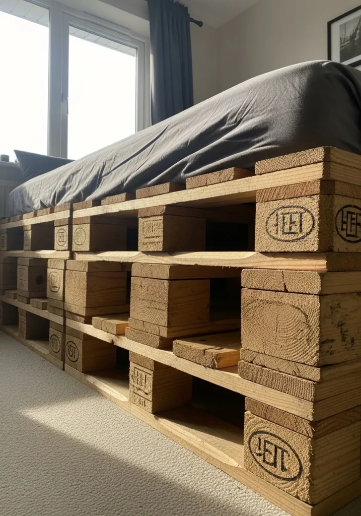 This pallet bed frame is built from thick stacked pallets that create a bold and sturdy base. The raw wood blocks and visible stamps give it a very hands on handmade feel. Paired with simple gray bedding and soft daylight from the window, the look stays practical and grounded while still feeling cozy and intentional.