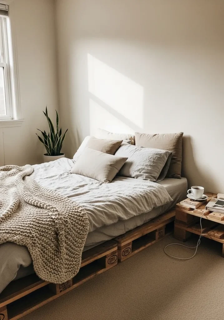 This pallet bed frame uses natural wood pallets to create a low and sturdy base that feels warm and inviting. The neutral bedding layers in soft beiges and creams, while a chunky knit throw adds texture and comfort. A small pallet nightstand and simple decor keep the space relaxed and practical, letting the sunlight do most of the styling.