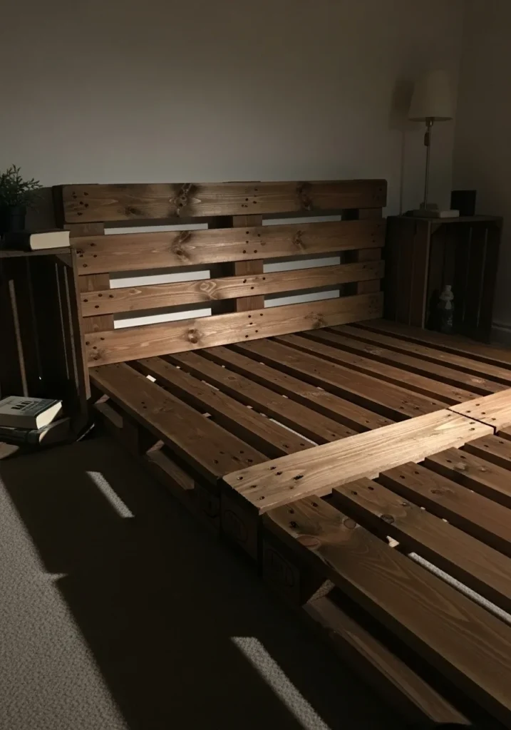 This pallet bed frame features deep stained wood that instantly adds richness to the room. The wide pallet slats form both the base and headboard, giving the bed a strong and cohesive look. Soft shadows, minimal decor, and simple side crates keep the focus on the wood texture while creating a calm and slightly dramatic atmosphere.