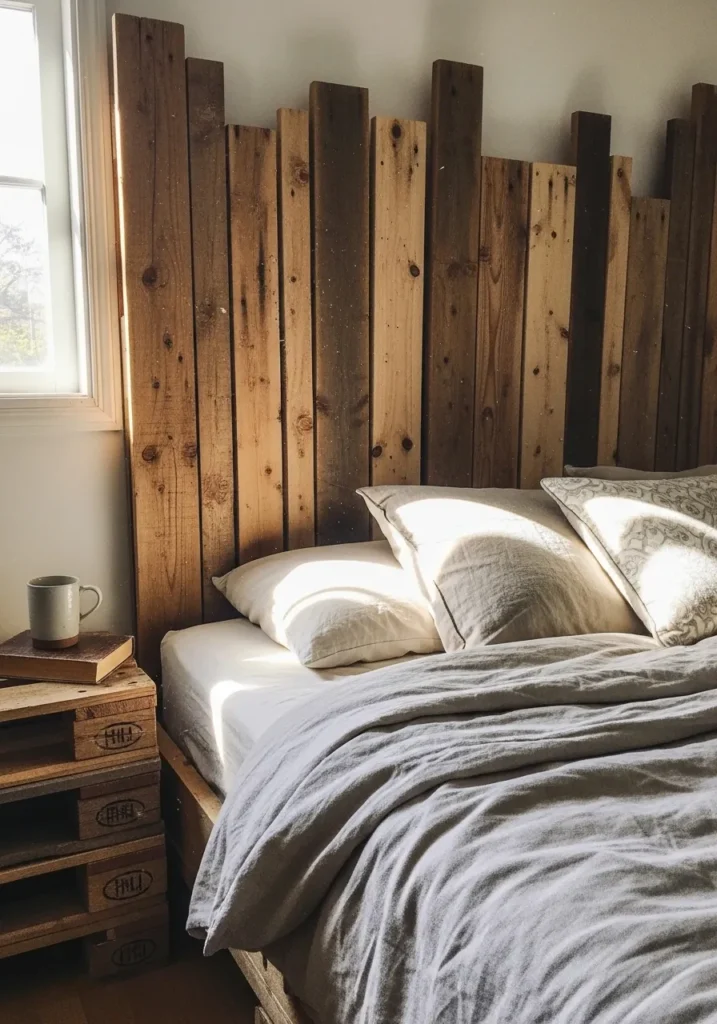 This pallet bed frame features a bold headboard made from tall vertical wood planks in mixed natural tones. The uneven heights and visible knots give it a strong rustic look that instantly draws the eye. Soft neutral bedding and a simple pallet nightstand balance the texture, keeping the space cozy and grounded.