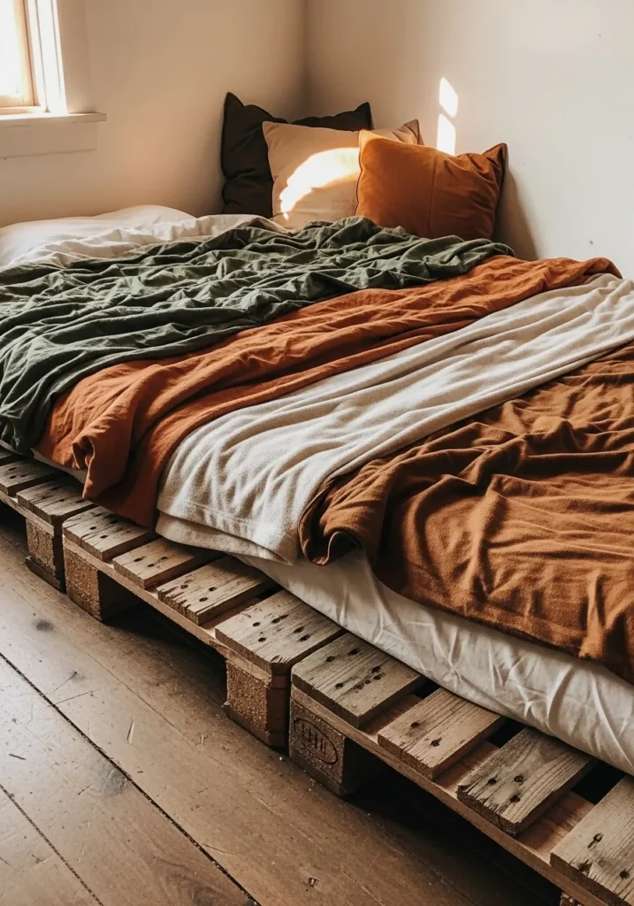 This pallet bed frame uses natural wood pallets to create a low and sturdy base that feels grounded and cozy. The raw wood pairs beautifully with layered bedding in warm rust, olive, and cream tones. Sunlight spilling in from the window highlights the texture of the pallets and the soft folds of fabric, giving the room a relaxed and inviting feel.
