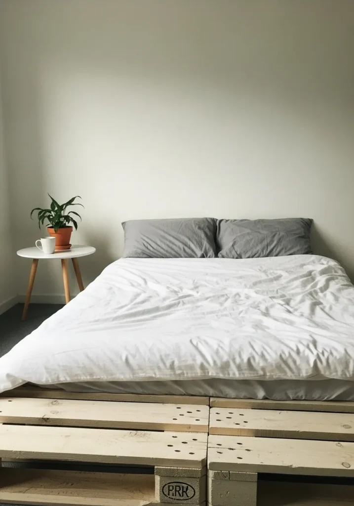 This pallet bed frame keeps the look light and uncluttered with pale wood pallets forming a low platform base. The clean lines and visible screw holes give it a subtle handmade feel without adding visual noise. Soft white bedding and gray pillows sit against bare walls, while a small side table and plant add just enough warmth to balance the simplicity.