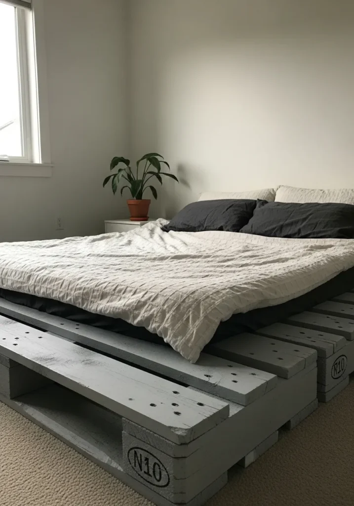 This pallet bed frame is built from stacked pallets painted a gentle gray, creating a low and sturdy base that feels relaxed and approachable. The wide slats give the bed a solid look, while the neutral color blends easily with light walls and carpeted floors. Simple bedding in soft whites and charcoals keeps the room feeling balanced and uncluttered.