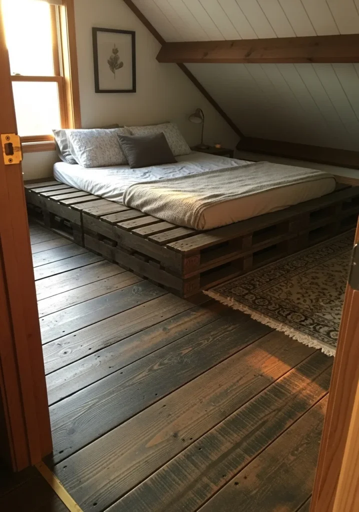 This pallet bed frame sits low and solid, built from dark stained pallets that match the cozy attic setting perfectly. The wide slats create a strong base while still feeling handmade and relaxed. Soft neutral bedding, a simple rug, and exposed wood beams bring warmth to the room and make the space feel grounded and inviting.
