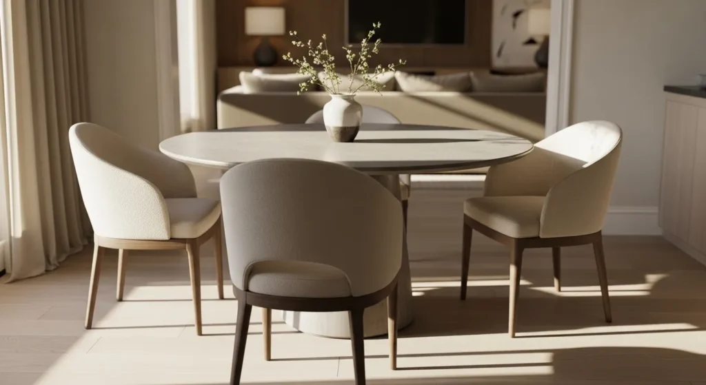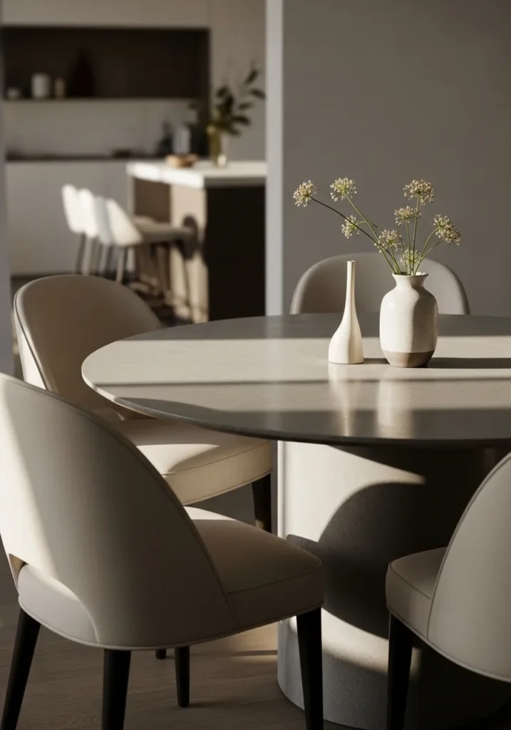 This dining room features a round stone table paired with curved upholstered chairs in soft neutral tones. The smooth tabletop adds a modern edge, while the rounded shapes keep the space feeling gentle and inviting. Light flows in from nearby windows and softens the overall look. It feels modern but still very warm.