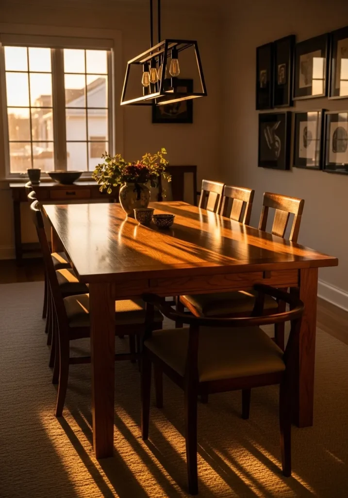Rich Wood Dining Table With Golden Hour Warmth