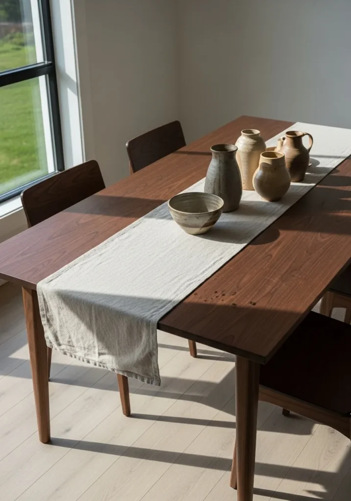 This dining room showcases a warm-toned wooden table styled with a soft fabric runner and simple ceramic pieces. The clean lines of the table and chairs give the space a modern feel, while the natural wood keeps everything inviting. Sunlight coming through the window adds warmth and highlights the wood grain beautifully. It feels fresh, relaxed, and thoughtfully put together.