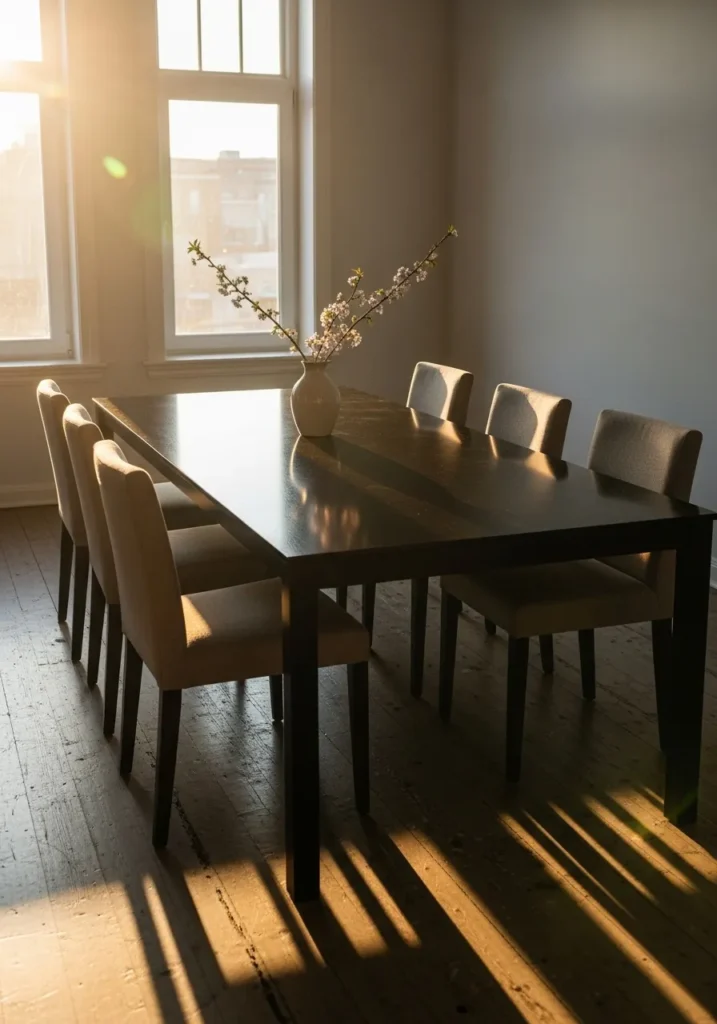 This dining room highlights a dark rectangular table surrounded by upholstered chairs, all bathed in warm evening light. The long table creates a strong visual anchor, while the soft shadows add depth and richness to the room. Large windows allow sunlight to stretch across the floor, giving the space a dramatic yet inviting feel. It feels classic with a modern edge.