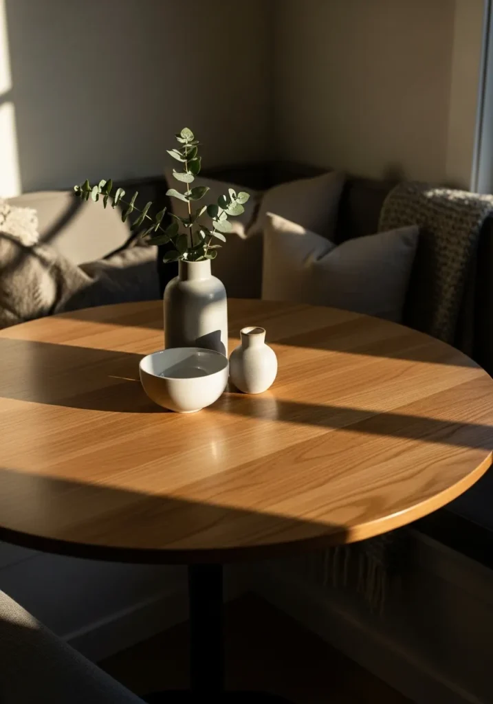 This dining space features a round wooden table tucked neatly into a corner banquette, creating a warm and intimate setup. The rich wood tone catches the sunlight beautifully, while simple ceramic decor keeps the table feeling clean and uncluttered. Soft cushions and neutral walls make the space feel calm and comfortable without looking overly styled. It feels like a thoughtful use of space that still looks polished.