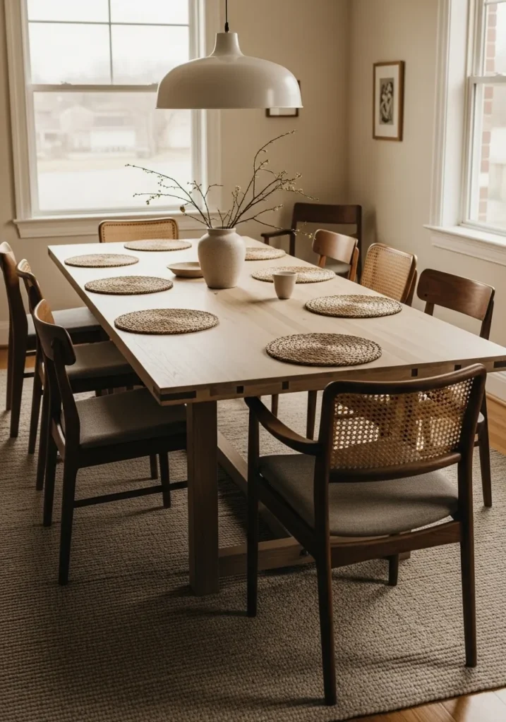 Warm Wood Dining Table With Soft Layered Styling