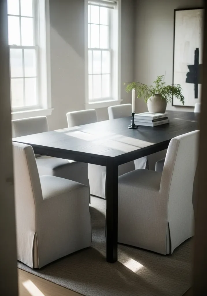 I love how grounded this setup feels. The black table adds drama, but the chairs soften everything and make it feel comfortable. It feels like a space that looks elegant in photos but is still great for everyday meals. That mix of style and comfort really speaks to me.