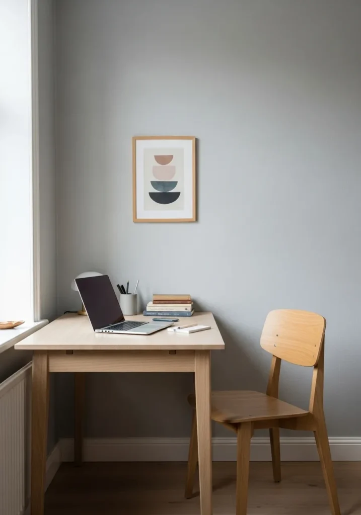This setup shows a slim wooden table tucked neatly against the wall, paired with a single chair and just enough surface space to shift between work and meals. The clean lines and light wood keep it feeling airy, while the wall placement makes smart use of an otherwise forgotten corner. It is the kind of table that quietly adapts to your day without demanding extra room.