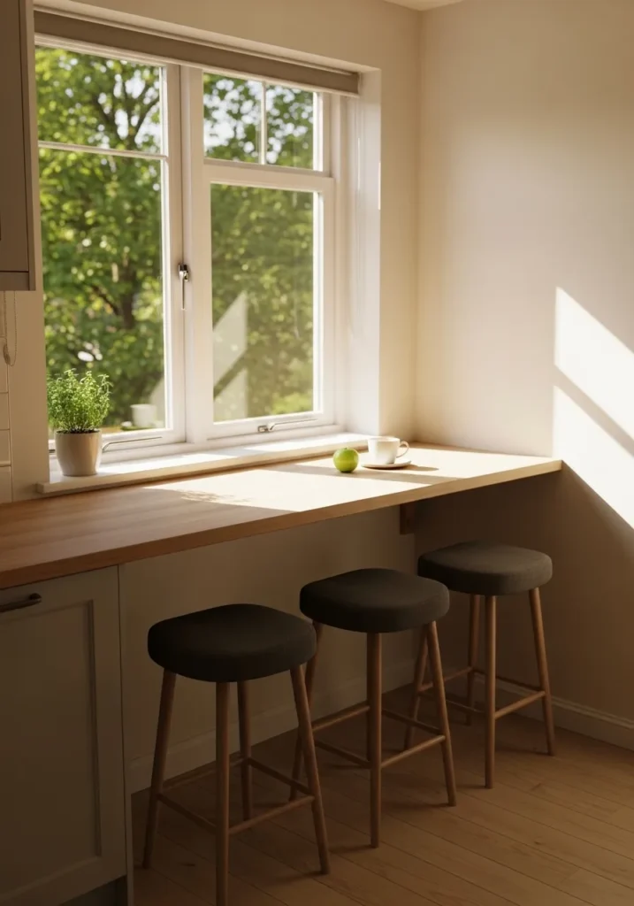 A built in counter runs along the window, paired with simple stools that slide right underneath. It works as a dining area without needing a separate table at all. The window brings in light and makes the space feel larger.