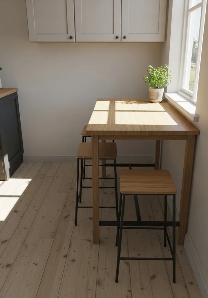 This narrow bar height table fits neatly along the kitchen wall, paired with simple stools that slide all the way in. It uses vertical space smartly while keeping the floor clear, which makes the whole kitchen feel less crowded. The light wood surface reflects daylight and keeps the look fresh.
