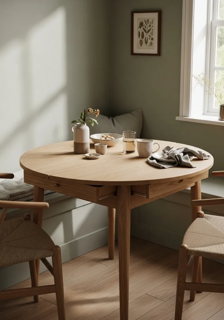 A compact round table sits by the window, surrounded by lightweight chairs that keep the space open. The circular shape makes movement easy and avoids sharp corners in a small room. Natural light gives the wood a warm glow.