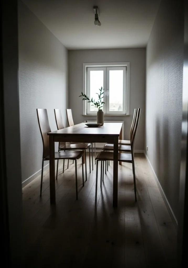 A slim dining table is placed lengthwise in a narrow room, with chairs lined up neatly on each side. The proportions are kept minimal so the space still feels open. Light from the window draws the eye forward and makes the room feel longer.