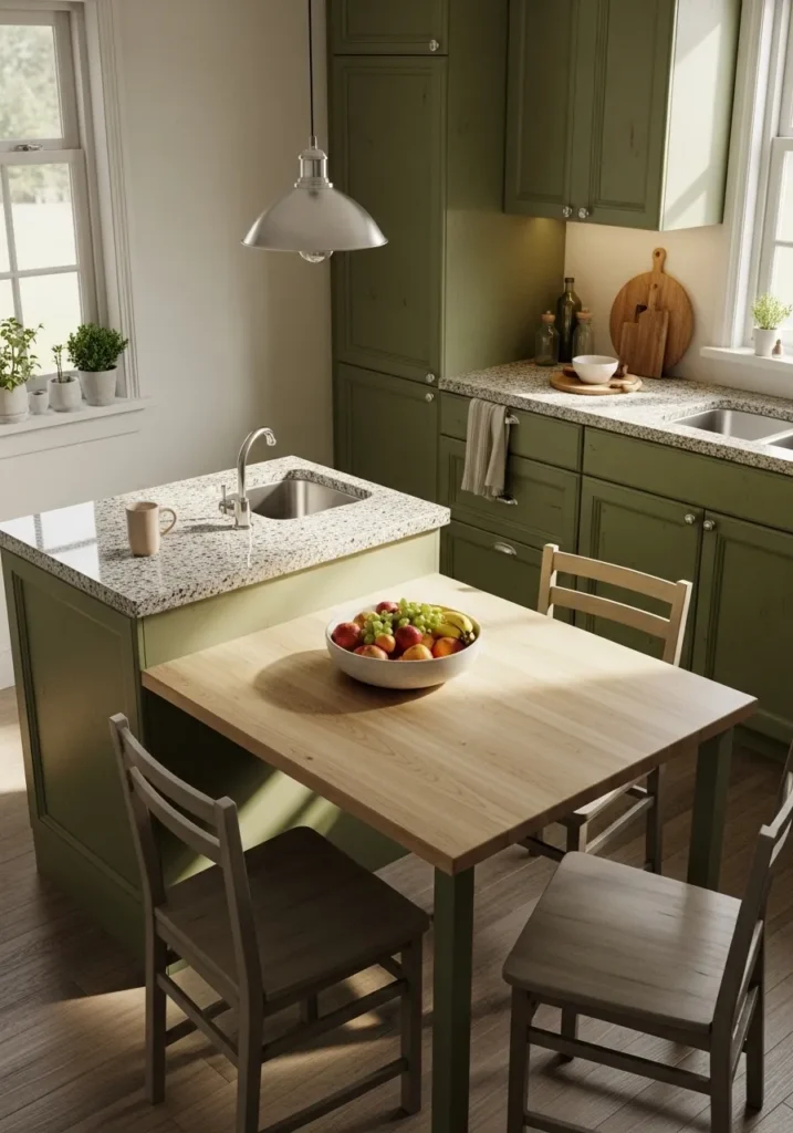 A small square dining table fits perfectly into a compact kitchen, offering enough room for daily meals without blocking movement. Simple chairs keep the look light, and the table sits comfortably near the cooking area for easy use.