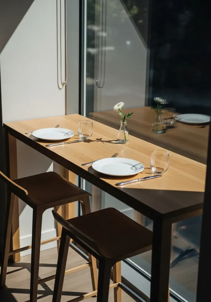 This slim table is placed right by the window, paired with bar stools that keep the footprint minimal. The tabletop doubles as a dining surface and a prep area, making it extra functional. Natural light makes the space feel open and calm.